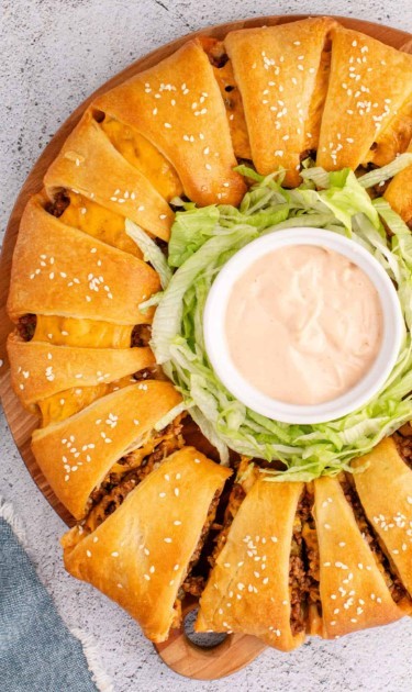 The epitome of easy, enticing appetizers and delicious dinners, the Cheeseburger Crescent Roll Ring looks every bit as luscious as it tastes! If a big, juicy burger decided to get all dressed up for dinner, it would look like this Cheeseburger Crescent Roll Ring! This super simple recipe starts with a flaky, buttery crust made with canned dough that wraps around a fabulous, 5-ingredient filling of ground beef, cheddar cheese, mustard, ketchup, and pickles. This is one of the best ground beef recipes ever...